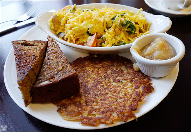 ... with mushrooms, seasonally anemic tomatoes, onions and Tilamook Cheddar. Banana bread and a potato pancake with applesauce surrounded the scramble in a starchy skirt.