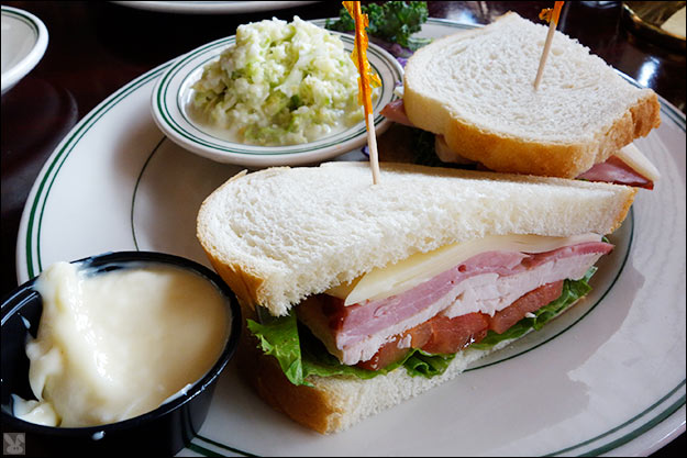 ... was slices of sourdough bordering turkey, ham and Swiss in a oddly un-special stack. Coleslaw was chopped into a rough pesto-like texture and had a sweetened edge that wasn't our thing.