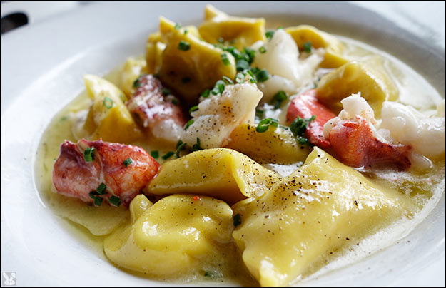 ... was sweetened with corn and mascarpone and strewn with lobster at A Cena. These maize mits were buttery bundles followed up by halibut ($28.00):