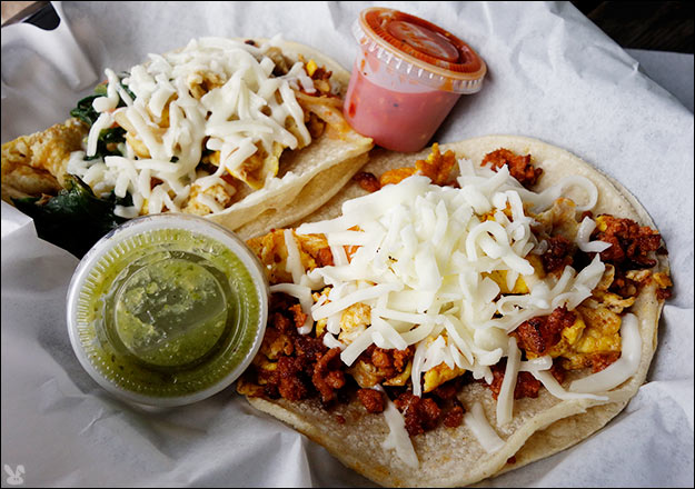... at El Guero were topped with scrambled egg and cheese. The chorizo trumped the plain portion as we warmed our bellies with these sating circles.