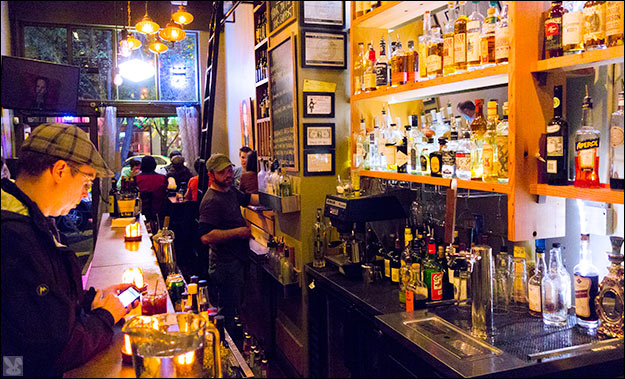“20 Fountains” ($9.00) primed our palates with rye and Carpano Antica in a pleasing Peychaud-pumped, Regan-rigged refreshment while the “Bourbon Snap” ($9.00):