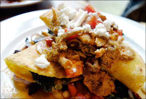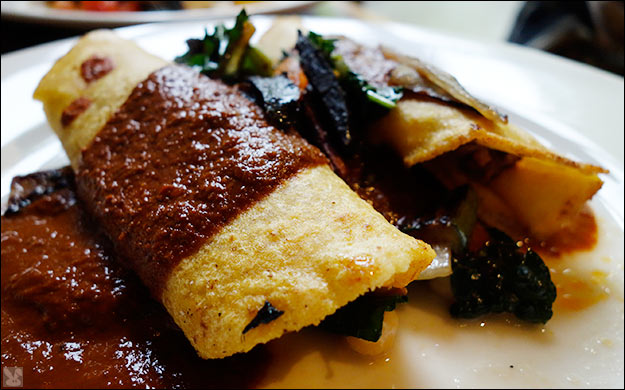... which was a porky packet of choco-chilied tortilla with a white bean mash an a tumble of vegetables washed down with a draft Negro Modelo with lime: