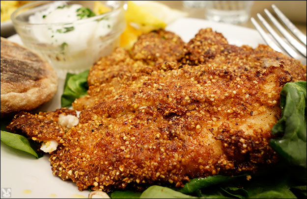 ... was fried to produce a golden armor of cornmeal sauced with the yolks of poached eggs. This was a fine feline fish dish but would have been even better if the coffee that washed it down wasn’t weak.