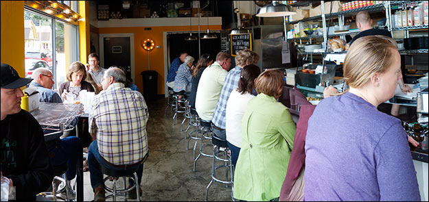 ... kaiser rolled up in a runny-yoked round up of sautéed onions and white Cheddar with slivers of dill pickle to punctuate the protein. Both were solid, satisfying, breakfast bundles.