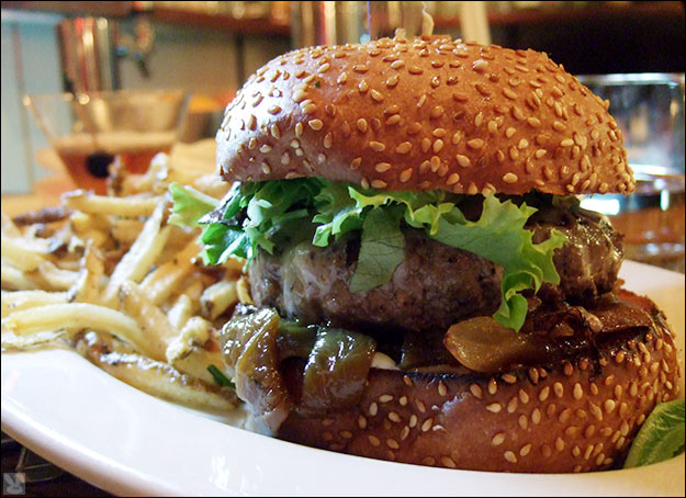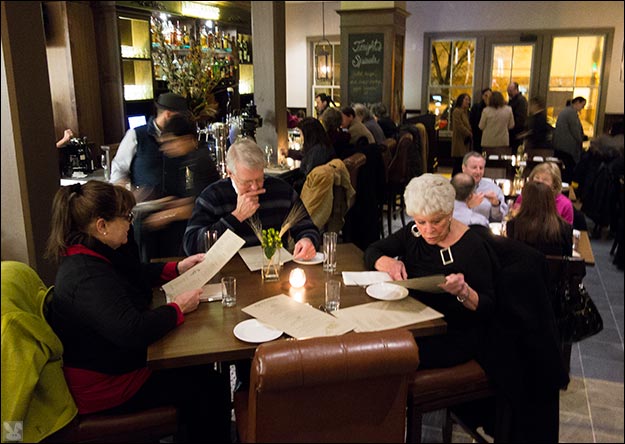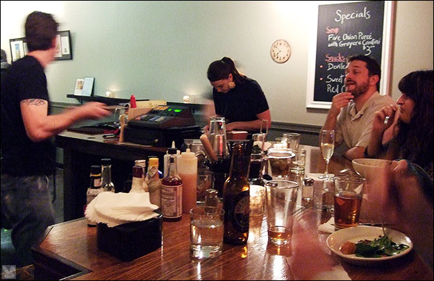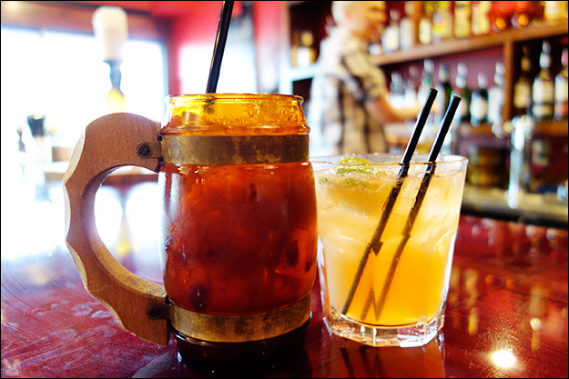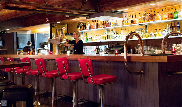 ... during happy hour where a barrel mug of "Redwood Original" ($8.00) with bourbon, vermouth and bitters and a "Young American" ($8.00) with muddled lime, Makers Mark and ginger ale whet our whistles with sparkling, whiskied, perkiness.