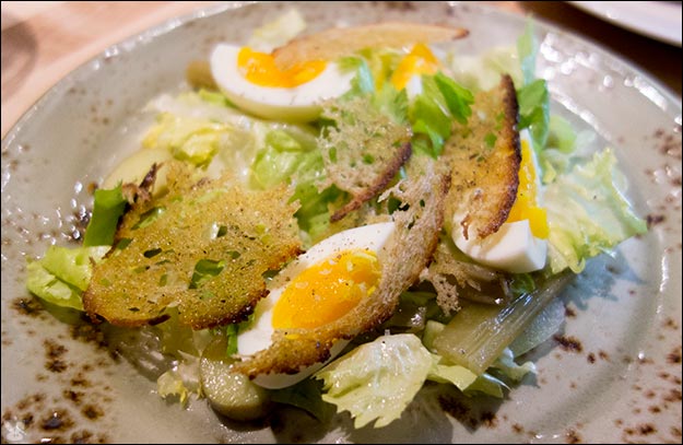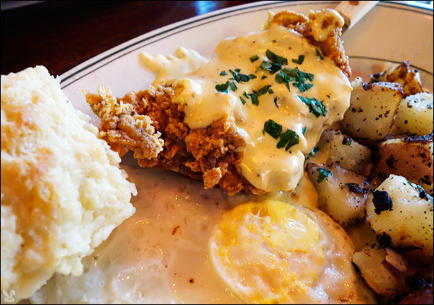 ... with a cornflaked crust. Moist meat and a crunchy, cereal shield was gilded with gravy and yolky runoff from a couple of overeasies. A drop biscuit 'sorbed the surplus sauce along with some spuds that collected crispness from the griddle.