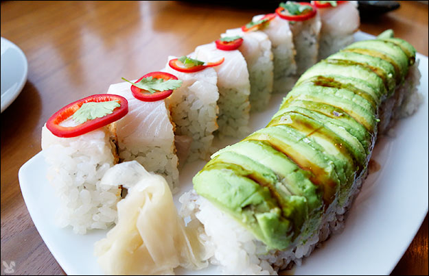 ... as well as a caterpillar ($9.00) and hamachi and pepper-topped crab roll ($17.00):