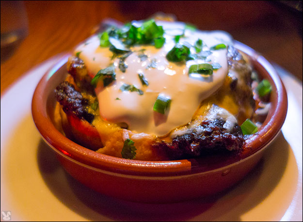... didn't come in the traditional, slashed open bag, but was a fancier foray into this chippy chomp with scoopy shaped corn-figurations cradling cravable chiled chili topped with sour cream.
