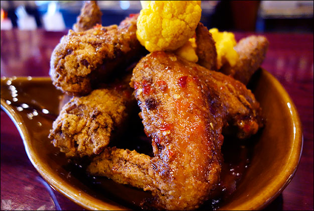 ... were moist, meaty, crisp-crusted clucker with a hint of hot and a swagger of sweet. Pickled cauliflower offered crisp, vinegary contrast to these fine flappers.