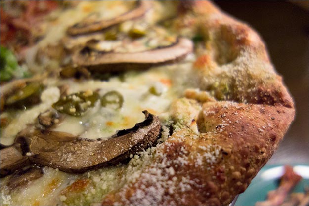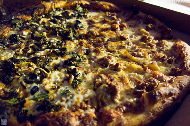 ... where the kind pie man delivered our half pepperoni, half mushroom, kale and goat cheese 'za ($20.00).