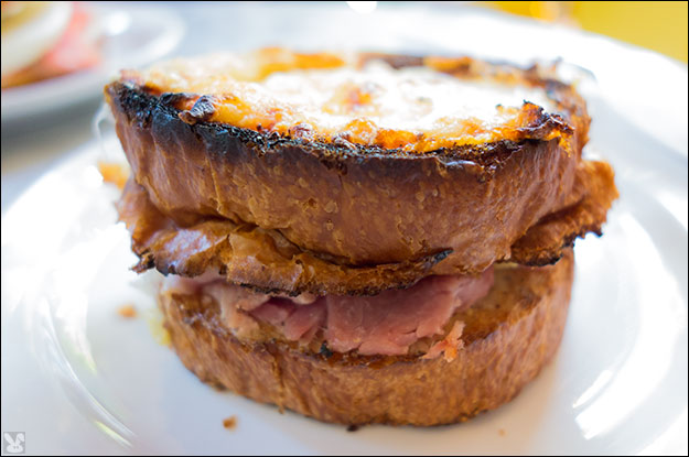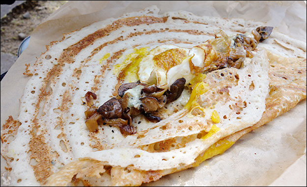 ... filled with baked eggs, chorizo, Gruyere and peppers planted between two crispy corn tortillas.