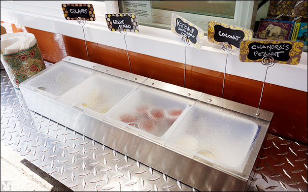 Chili and peanut, black sesame and dals all ignited our interest along with a cilantro and a peanut chutney from the selection at the chutney bar.