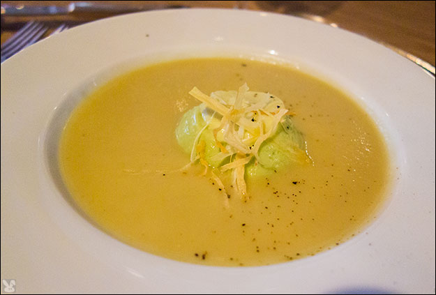 Din Din’s prix fixe Alpine themed supper ($85.00 per person) began with sparkling wine and lox and paté toasts before we sat down at a communal table for a nice kohlrabi soup: