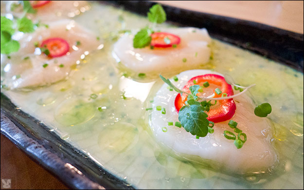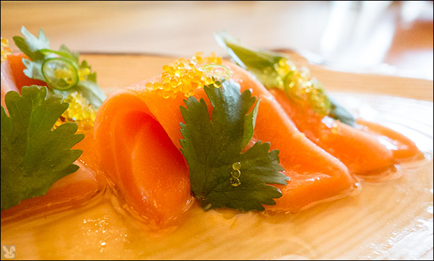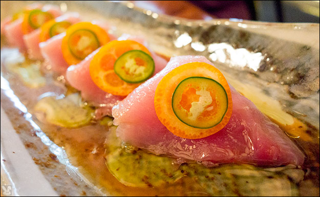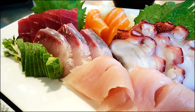 ... held a sashimi selection of maguro, hamachi, albacore, sake and tako enriched with bits of avocado.