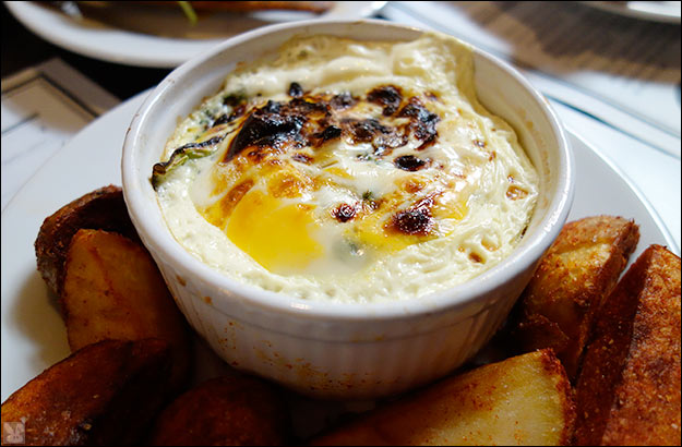 ... with cotija cream nested on kale with pickled onion. This was okay, but we yearned for runny yolks so the poached egg ($8.00):