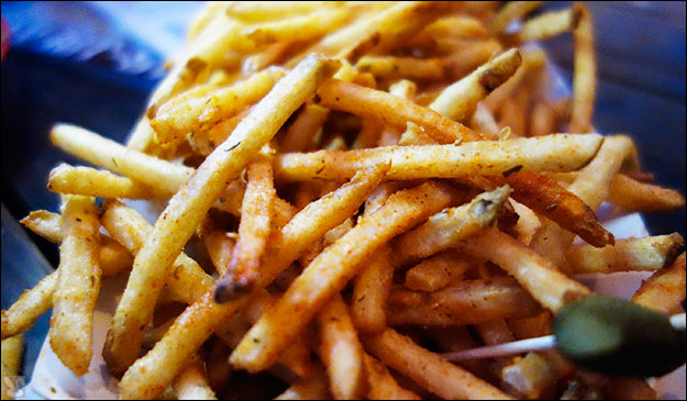 ... was bacon-bound and fringed with fries. The spuds weren't as crisp as we prefer and the patty was a little parched but it was still solid sports sustenance in a hospitable hub with grub.