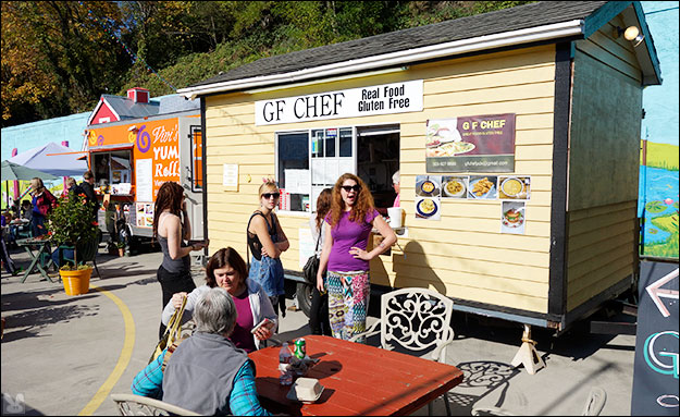 ... at GF Chef bundled bacon, mushrooms and Cheddar in a homey hump that was on the oily side, but still okay. “Mustang” potatoes galloped along side in a dice of seasoned spudage in our “GF” (gluten free) breakfast at this friendly cart.