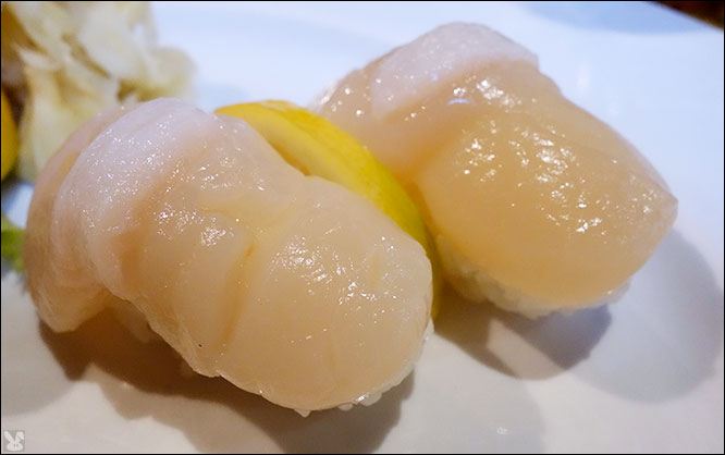 ... with octopus, yellowtail, fluke and salmon followed by nigirized scallops ($7.25):