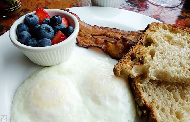 Over easies with crisp bacon ($10.50 plus $2.50 supplement for fruit):