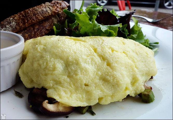 Asparagus, goat cheese and mushrooms filled a fetal fold of a chef's omlette: