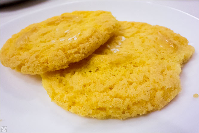 Our random purchase has us chomping on a meringue filled with peanuts and sesame seeds with a strong (but not bad) artificial-tasting, banana flavoring.