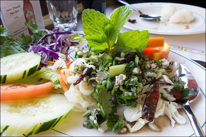 ... were the protein in a minty mound with cukes and tomato. Roasted rice, lime, and chiles fringed this fine, fish-sauced egg salad but even though there are bugs featured, the majority of the menu is crawling with creations that don’t respond to raid.