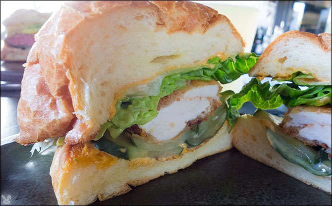 This fowl was finished with a fry to crust this crisp of this breast bundled in brioche perked with pickles and gemmed with a little lettuce.