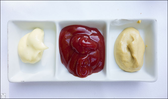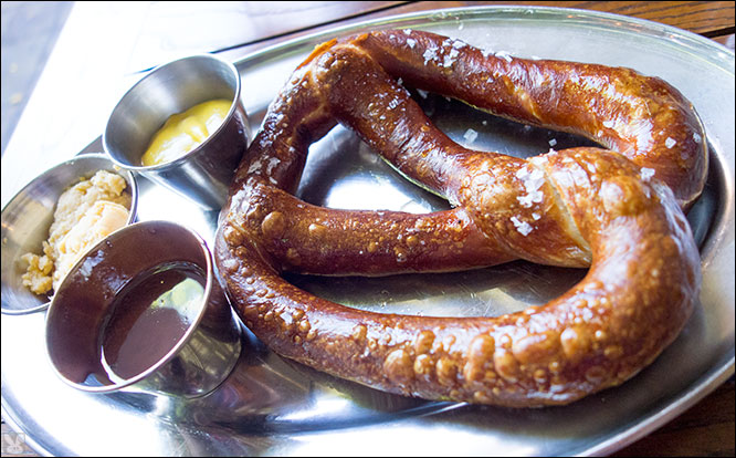 ... was a band of bread boosted with a sides of sauces. The chocolate didn’t do it for it for us, but the mustard melded mightily.We also left the congealed beer cheese sauce aside.