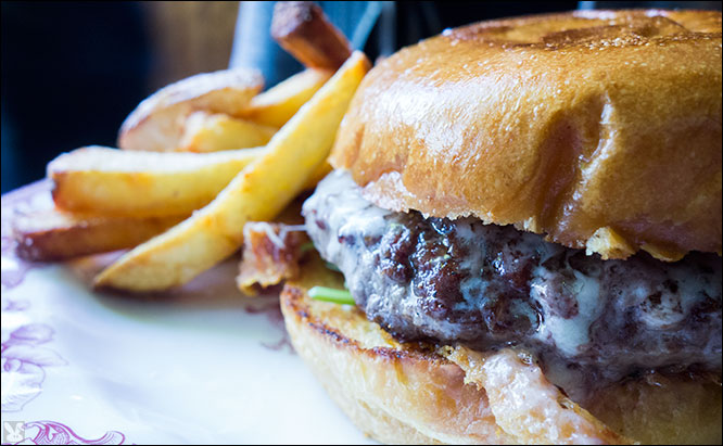 ... that were maple-glazed, bacon-spudded studs. These sweet and salty, sating, starch sticks went down with a hatch chili burger ($10.50):