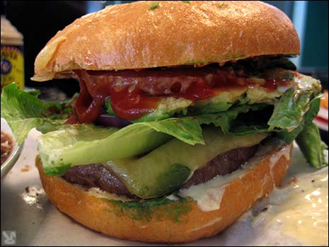 accessorized this overly mayonnaised tower. Chubby got the California burger ($7.35): ... which comes with jack cheese and avocado. The anger management/punching bag activity on the patty didn’t help this to rocket to the top of our burger list. It was good, but not great. He got his with a side of chili ($1.95) which wasn’t bad. It had a good chilli flavor and nicely textured beans. He asked if crackers were available and the pleasant waitress said they didn’t have crackers so she brought croutons instead.