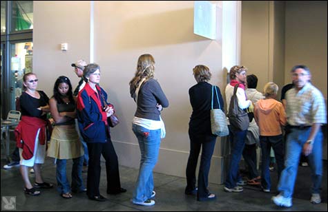 My body is a temple, not an amusement park. It doesn’t take a nutritionist to figure out that my recent dietary intake has been off the (dangerously) pointy end of the food pyramid. For this reason, it seemed like it was time for something pure and that means sushi. Ozumo gets fully booked at lunchtime so I was glad we made a rezzie. Chubby and I waltzed by the impromptu diners at the bar and headed for the sunny dining room in the back. The focal point of this room is the large, square sushi bar: ...manned with a crew of knife wielding fish cutters. We started with miso soup ($3.00): ... which had chunks of tofu and would have been standard issue if it wasn’t for the plentiful wakame seaweed. The server told us the specials (sans prices) and we requested the dynamite roll ($16.00): ... which did not live up to it’s name unless you count the explosive price for this lackluster, tempura battered maki with a dense, homogenous, mildly spicy, tuna filling. The shower of scallions and tobiko made it look nice, but as my friend TW says, “just because it’s pretty, doesn’t mean it’s good to eat.” My Mifune Bento ($13.50) came with some pleasant taro and hijiki salads. The maki were standard issue California roll and spicy tuna. The nigiri: ... included tuna, yellowfin, salmon, cooked shrimp, omelet and eel. The salmon was the best of the bunch with a buttery texture and subtle flavor, the rest were what you would expect. Chubby got the Kurosawa Bento ($19.50): ... which had a taro, seaweed and spinach salad as well as nigiri sushi and sashimi. This was the better of the two bentos (since the maki in the Mifune were meh…maybe they should rename it “meh-fune”?) We got a pot of green tea ($6.00): ... which was served in a heavy iron pot (difficult to maneuver with furry paws) once we got it into our cups (from this anvil serving unit) it was fragrant and delicious. It’s obvious that they put a lot of care into the design so it’s a shame that the chairs look so uninviting. They are a pale yellow advertisement for Scotchguard. The various food, beverage and hair product stains are seriously unappetizing (and you really don’t want to sit on them either.) If I were a re-upholsterer, I would have tried to drum up some business “on the spot.” I was reminded of Postrio when I entered the (clean and well stocked) restroom and heard language tapes. I’m all for multi-tasking in the banjo. As San Francisco lunch experiences go, this was okay. It’s a good place for office lunches because they can easily accommodate big parties (in the dining room or in their private area that is walled off with sake bottles.) I don’t think we’ll be heading back anytime soon, but if they re-do their chairs, I may consider it. Ozumo