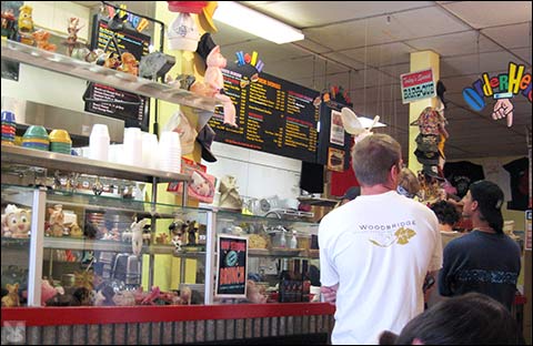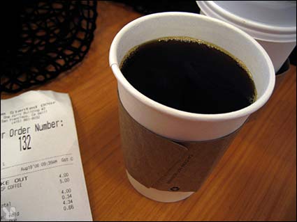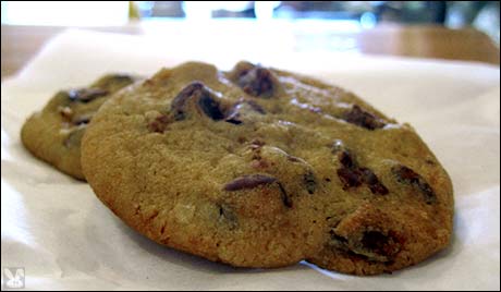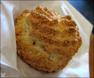 buttery, but soft (my preference is crisp) they were still good. You have to have a bit of a sweet tooth to fully appreciate this dense haystack of chewy cholesterol. We bypassed the century-long wait at the Blue Bottle stand as well as the line at Peets (that stretched well out the shop into the hall) in favor of the immediate service at Out the Door. We then downed our cups of Blue Bottle coffee ($2.00 each): ... before hitting the road.