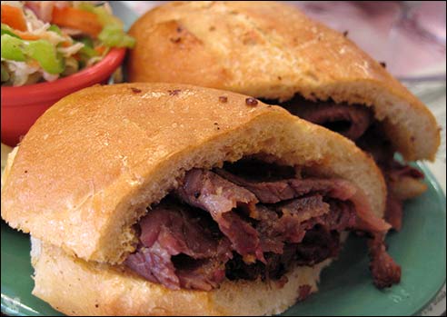 I have been ordering rib tips for the last several visits to Memphis Minnie’s but today, I broke with tradition and went with the Pastrami Sandwich ($8.95): This Wednesday only special is made with meat that they cure and smoke themselves. The moist slices of sweetly sauced succulence were encased in a soft roll. If you expect a New York style assembly, you will be bitterly disappointed, this is a barbeque house version and a good one at that. A few shakes on their hot sauce and I was in hog heaven with my cow sandwich.