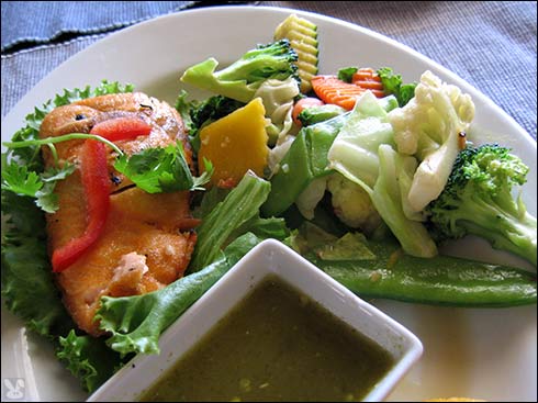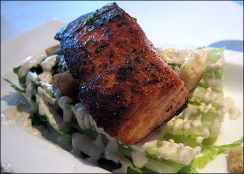 a generous slice of perfectly cooked fish arrived atop a Caesar