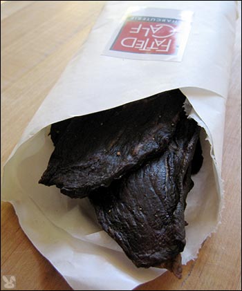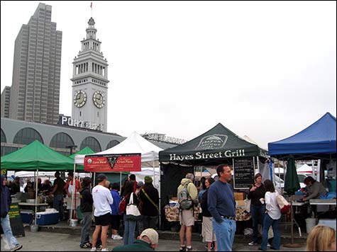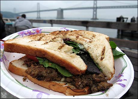 Just to see how the other half lives, we went to the San Francisco Ferry Building's Farmer’s Market at 8:30 this morning. Our habit of rolling in later in the day delivers the penalties of massive crowds and limited selection. Our first stop was the Fatted Calf, which had full product availability. Taylor describes the beef jerky: ... as “grown up.” I would have to agree. These sheets of Marin Sun Farms beef have a peppery smokiness and a satisfyingly chewy resistance with a deep, primal, carnivore appeal. The pork rilletes: ... spread like a piggy butter over slices of toasted, garlic rubbed levain. The guinea hen terrine: ... was infiltrated with swine as well in this slice of meaty satisfaction. After securing our protein purchases, we made a loop to pick up produce and cheese before stopping at the Hayes Street Grill booth for breakfast. I got the Marin Sun Farms chorizo scramble ($7.00): ... which was served with grilled pain de mie. Bacon ($1.50) and slices of tomato (.50¢) gave a boost of flavor to the disappointingly tough, overcooked eggs. Chubby was surprised when he got his oyster po boy ($7.50): He was expecting a soft, slightly hollowed out roll instead of grilled pain de mie. The fried oysters, mayo, tomato and lettuce sandwich was homey and good, but nothing re-orderable. They cooked the shellfish until they were nicely squiggly in the middle with crunchy edges. The tomato sector was limited to two small circles in the center, it would have been better if they diced them up to even out the bite distribution. Instead of a baby lettuce mix, a chiffonade of iceberg lettuce would have been a better (albeit not as uptown) contrast of textures in this mostly soft sandwich. The biggest improvement they could make to this sandwich is to swap out the bread for a roll. The thin white bread slices soaked up the juices and got mushy and flattened out with every bite. For dessert, it was off to the Noe Bakery stand: ... for a couple chocolate chip cookies (.75¢ each): ... which were