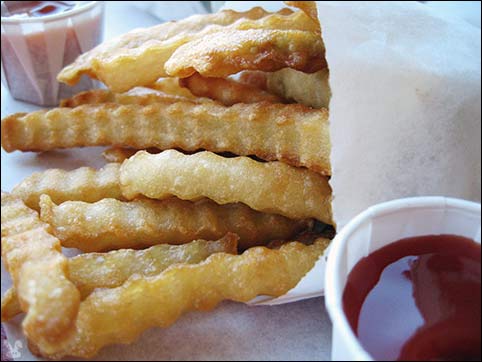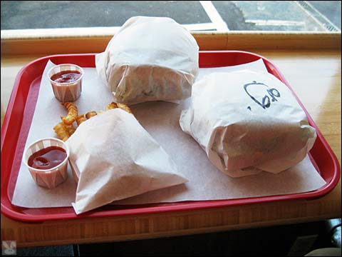 shack. I liked the way M&G matched the patty and bun diameters so that there are not bread-only bites. The organic beef was packed densely into a patty that was a little too thin for the ideal meat to bread ratio. The bun was soft, but held up to the burger even so. I wasn’t crazy about their “special sauce” which was a mayo/ketchup/relish spread. Chubby got the Prather buffalo burger ($7.25): ... which he cleverly ordered without the special sauce. His burger was okay but didn’t fully deliver in the texture, flavor, and bread to meat ratio departments. We decided that it was best to leave the specialty, organic meat burgers to other venues. Our fries ($1.30 for small): ... were delivered to an extra crispy doneness as we specified. They were fine, but nothing to get too excited about. They serve sandwiches, salads and soft serve ice cream in addition to the burgers and fries. M&G may not be trip worthy, but it is a good place for a standard burger experience without feeling you are supporting some evil corporate empire.