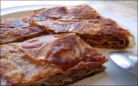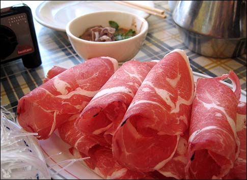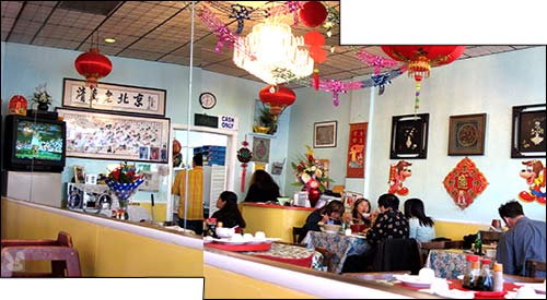 I don’t know what hot shot marketing researcher thought of the name of this restaurant, but I don’t think that they were targeting the white males between the ages of 17 and 34 demographic. Old Mandarin Islamic Restaurant may not be aimed at the MTV crowd, but they do have a TV on continually as well as festive ornamentation. The Peking Beef Pie ($6.95): ... is what would happen if a beef stuffed naan bread went-all-Reese’s with an onion cake. This fried Frisbee was heavy and a little greasy. After this “Peking” dish, we got a “Beijing” City-o-nym entrée. The Beijing style hot pot is a fun and tasty interactive dinner. The soup base and dipping sauce are three dollars per person. You then order things to cook up in this broth of star anise, little fishies, ginger and green onion. We got the sliced lamb: ... shrimp: ... and lamb kidneys ($6.95 each) as well as the sour cabbage and rice noodles ($3.50 each.) A propane hot plate heats this copper bundt/volcano pan of perfumed broth. The paper thin lamb and noodles cook lickety split, the previously frozen shrimp took a little longer (although we were told by the waitress that we were undercooking them.) My favorite was the lamb kidney: They were sliced into small chunks and cooked up quickly to a delicate and tender offal experience. I feel sorry for the lamb who is waking up in the motel room bathtub filled with ice with a note to call 911, but it was worth it. Old Mandarin Islamic Restaurant