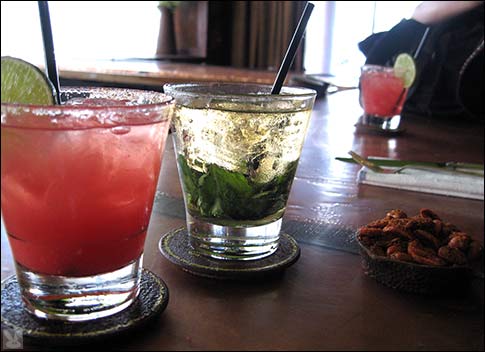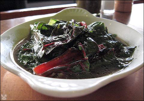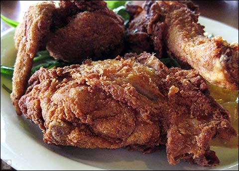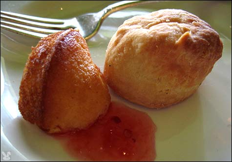 And on that farm there were some drinks… Watermelon Margaritas and Mint Juleps ($4 each during happy hour): ... were tossed back at at the Farmer Brown bar tonight with the newly married and shutter-happy C. The bartenders fashion cocktails from fresh herbs and fruits and serve them alongside a mini skillet of hot and spicy peanuts. Crisp little popcorn shrimp ($7.00): ... are served up with a remoulade on a bed of iceberg. These are perfect cocktail munching. The fried chicken ($12.50): ... had perfectly cooked dark meat (the white was a touch dry) and a crunchy coating alongside an overly rich and cheesy mac: The little salad offered a tiny bit of relief, but I was glad that Chubby had the foresight to order an astringent veggie side dish to Brillo off our taste buds. The sautéed greens ($4.00): ... was just the thing to take on the Tillamook challenge. The generous portion of red chard was a simple way to shake the etch-a-sketch of our palate upside down. Polly Pocket inspired biscuits and cornbread muffins: ... come with a pepper jelly to help deliver a carbo zing to the meal. Farmer Brown knows how to keep you fed and get you ploughed. The people who work here are friendly and efficient and it’s a fun place to grab a casual bite at the bar.