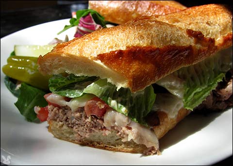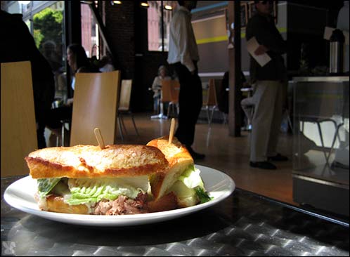 Mythic Portions I was finishing up a project and had to pass up a tasty sounding Chinese lunch with some friends. Later, when I came up for air, I walked along Pacific Avenue looking for somewhere to grab a quick bite. It had been a while since my last visit to Myth Café so I popped in for a roast beef sandwich ($8.50): ... which contained beautifully cooked, thinly sliced beef. It was a shame that this sandwich was so mono-cow-matic. The description sounded like it was full of flavor, but there were no crispy shallots or trace of the horseradish as the menu promised, only a melted, mild Fontina cheese, war rations of sliced tomato, romaine and some aioli. The baguette was not so much toasted as slightly heated to a rubbery bread jerky. It appeared as though the portion size took the front seat to the flavor. This huge sandwich delivers in the calorie to dollar ratio department, but was not an efficient flavor delivery system. I’ve had some good chow here in the past, so I may return, but I should have headed to the Helmand or Bocadillos for lunch today. Myth