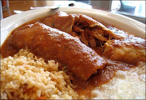 ... might not have been the most inspired selection on the menu, but I thought I would check out this flour tortilla duffel bag filled with sautéed mushrooms, tomato and onion along with small chunks of red snapper and salmon. The salsa de jitomate was a tomato and chili sauce with a shower of chopped cilantro. It was all okay, but Chubby made a superior choice. His Enchiladas diablo con pollo ($15.95):