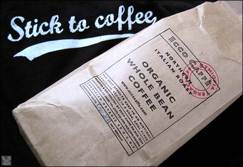 Sleepwalking out a window and breaking your back is one way to grab the attention of fellow bloggers. Not only did we get a commemorative t-shirt, but we learned of Mr. X Blue Bottle’s new home at a local coffee roaster, Ecco Caffé.