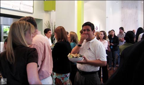 ... which tasted like the result of a food fight between Sara Lee and Oscar Meyer. I guess I could do worse. I stuck with the classic fare for this sort of event, fearing what horrors could be achieved if a dish actually required preparation. Anyway, a trip to the condiment bar with enough mustard and ketchup can work wonders. Cuddles worked the crowd and managed to avoid major injury (for today at least.) Comic-Con