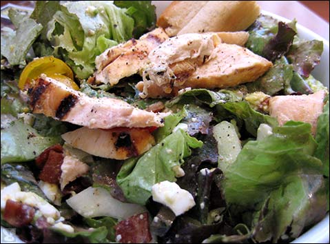 ... which has a butter lettuce foundation topped with white corn kernels, ripe avocado, halved (so they don’t squirt on your FiDi clothing) cherry tomatoes and chopped red onion. It’s dressed with a citrus vinaigrette and capped off with slices of seared ahi. A cube of bland Foccacia sits on top of the pile of green. The tuna had a hint of stringy resistance, but it was nicely seared and coriander scented. The corn leant a fresh crunch against the creamy avocado and pleasant acid of the slightly over ripe tomatoes. As far as a quick salad goes, it was pretty good. Chubby got the Cobb ($8.45):