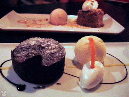 ... that stood out. The scallops were lightly sauteed and spiced not hot, but with a flavorful tang. The veggies were crisp and delicious. Out of our two desserts, the fave was the Chocolate Souffle with Mandarin Ice Cream ($8.00):