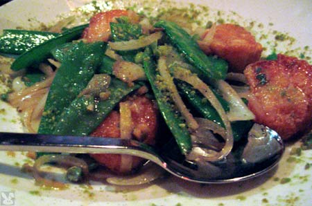 ...the raw tuna was top-notch, with a powerfully spicy sauce that was rich but not greasy. The requisite crispy bits were provided by the very lightly battered and deep fried eggplant platforms that acted like little vegetable-based toast points. In the larger plate department, The Kobe beef and red papaya dish was excellent, but it was the Ginger-Scallion Scallops & Snow Peas ($17.00):