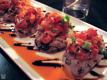 ... which was rich, crisp, and tangy. The fresh and tender yellowtail had a smooth non-fishy flavor. We enjoyed some potstickers, spring rolls, and calamari, though the favorite Dim Sum of the meal was the Spicy Tuna Tartare on Tempura Eggplant ($12.00):