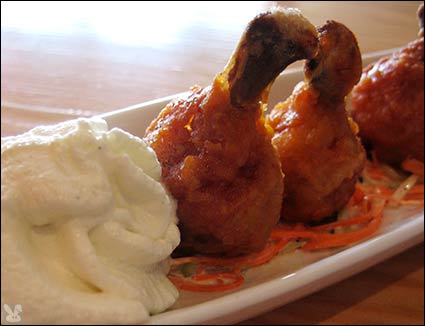 ... was my fave. I thought that they got the fish wrong when I saw the salmon colored top of this seafood terrine, but I was faked out by the pickled papaya. This mosaiced brick of the sea was an aggregate of avocado, tuna, sea beans, a grating of horseradish and some puckery lime. There were also little wasabi speed bumps piped on the plate. I would order this one again. The confit buffalo wings ($11.00):