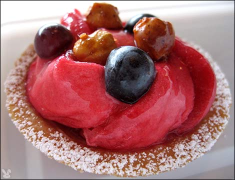 The salted peanut cookie was a chewy, nutty, sodiumy winner. I was less fond of the soft textured, chocolate chip (my personal preference runs toward the crisp ccc) and the chocolate dipped macaroon (which could have profited from larger coconut bits for more dimension.) The chocolate brownie cookie delivered the goods. I liked this rich and dangerous combo which was appropriately sized to avoid instantaneous cardiac arrest. The carefully constructed tartlettes ($3.75 each):
