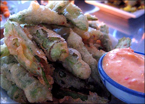 ... was dotted with capers and draped with Orca sized golden raisins. It was mildly seasoned and would have been even better amped up with some hot pepper, (but it was still good.) Tempura battered okra ($8.00):