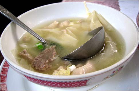 ... was the paper ornament jammed into the middle dumpling. They had the requisite browed bits, but were bland and generic. The wor wonton soup eventually arrived ($6.75):